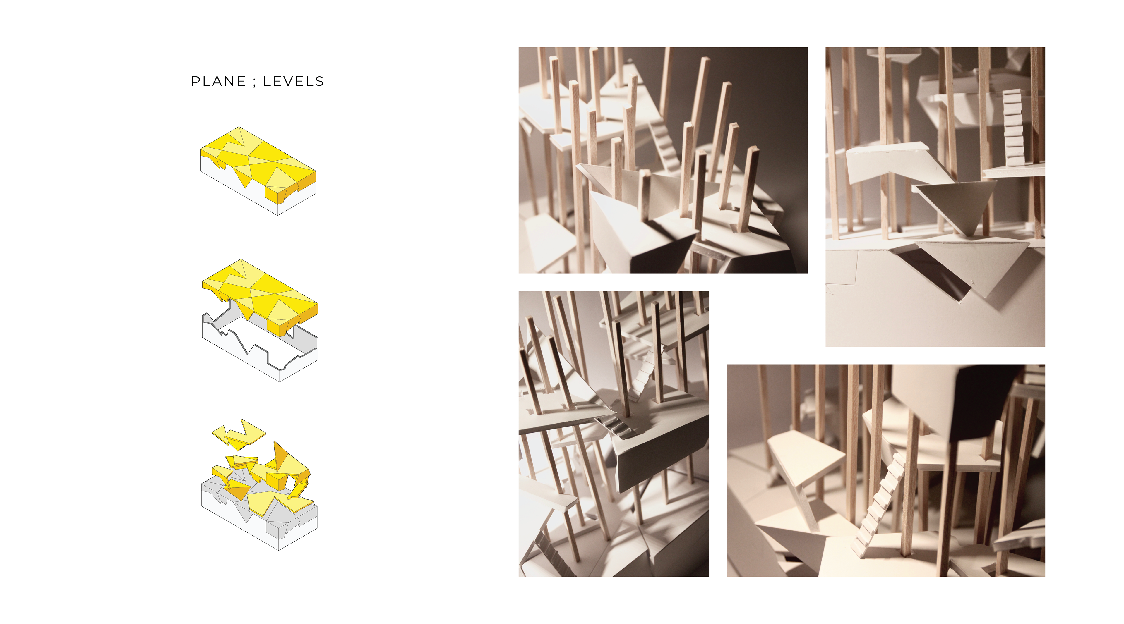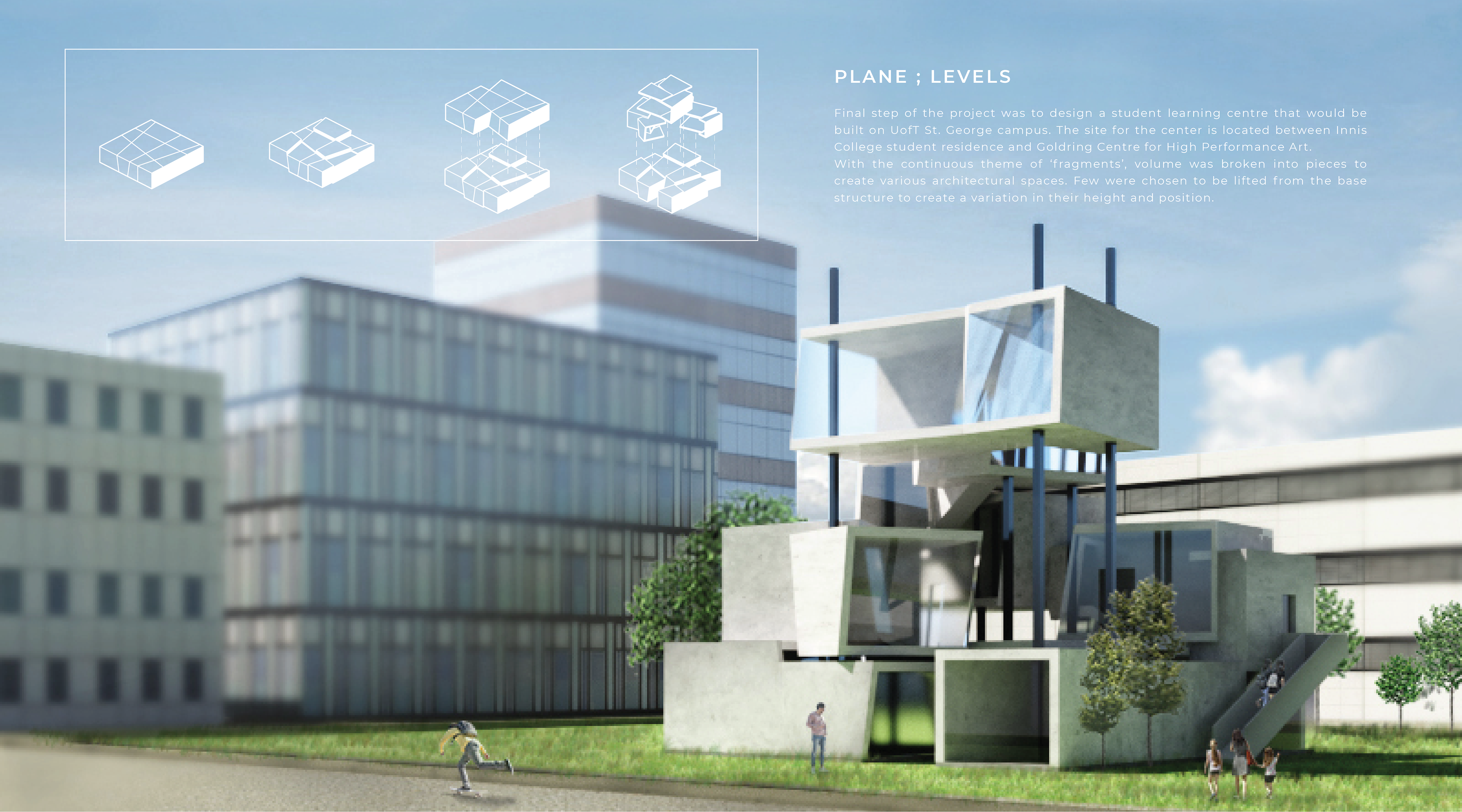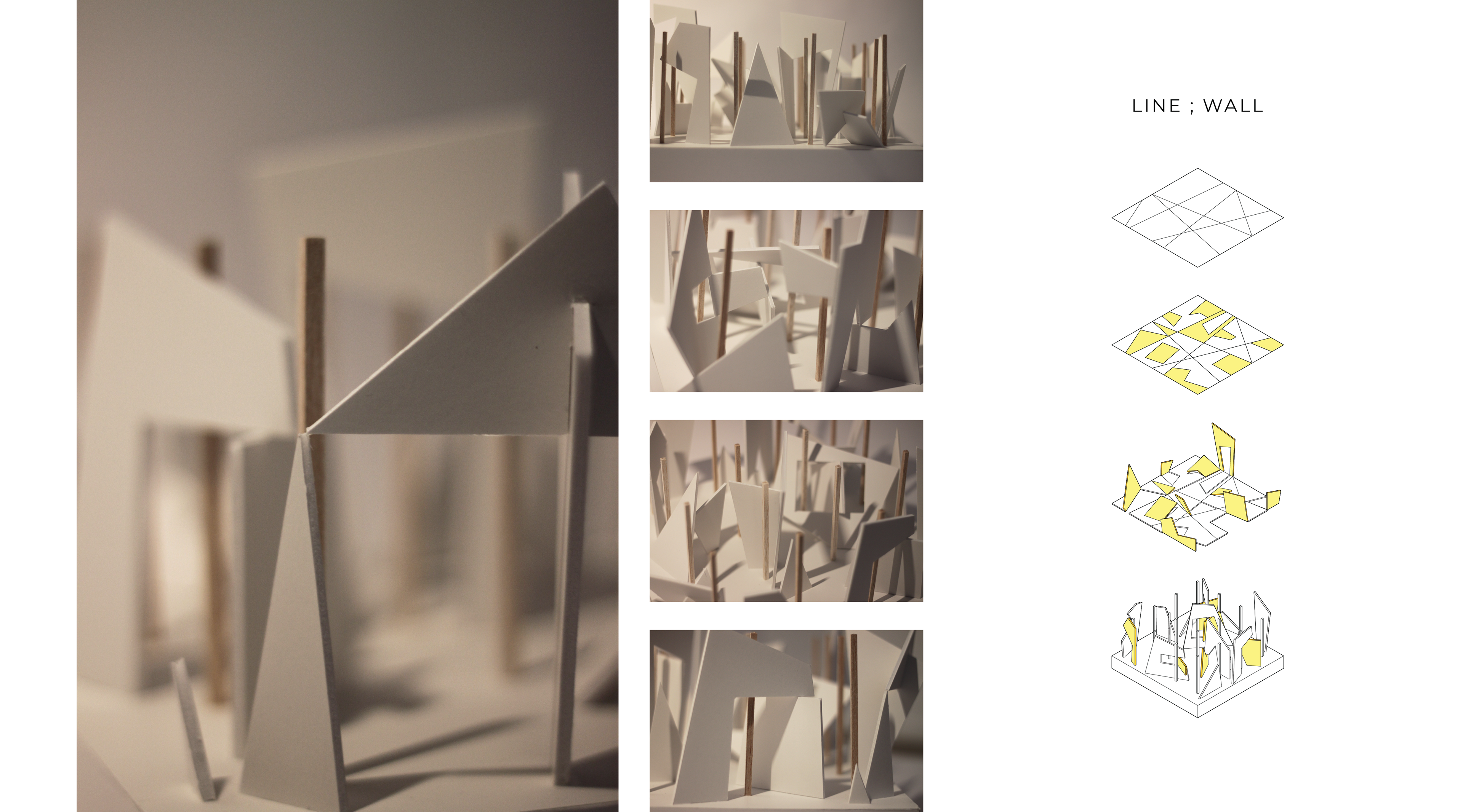 The project develops a concept through a series of design exercises with the topic of ‘line’, ‘plane’, and ‘volume’. The idea that I started with before getting into these exercises was finding ways to connect the base given to us and the structures to be created as the central part of each project. The main reason for doing this was to make the base to be part of and not look irrelevant to the design. In order to communicate the idea, I chose the word ‘fragment’ to act as a theme in structuring my design procedure.