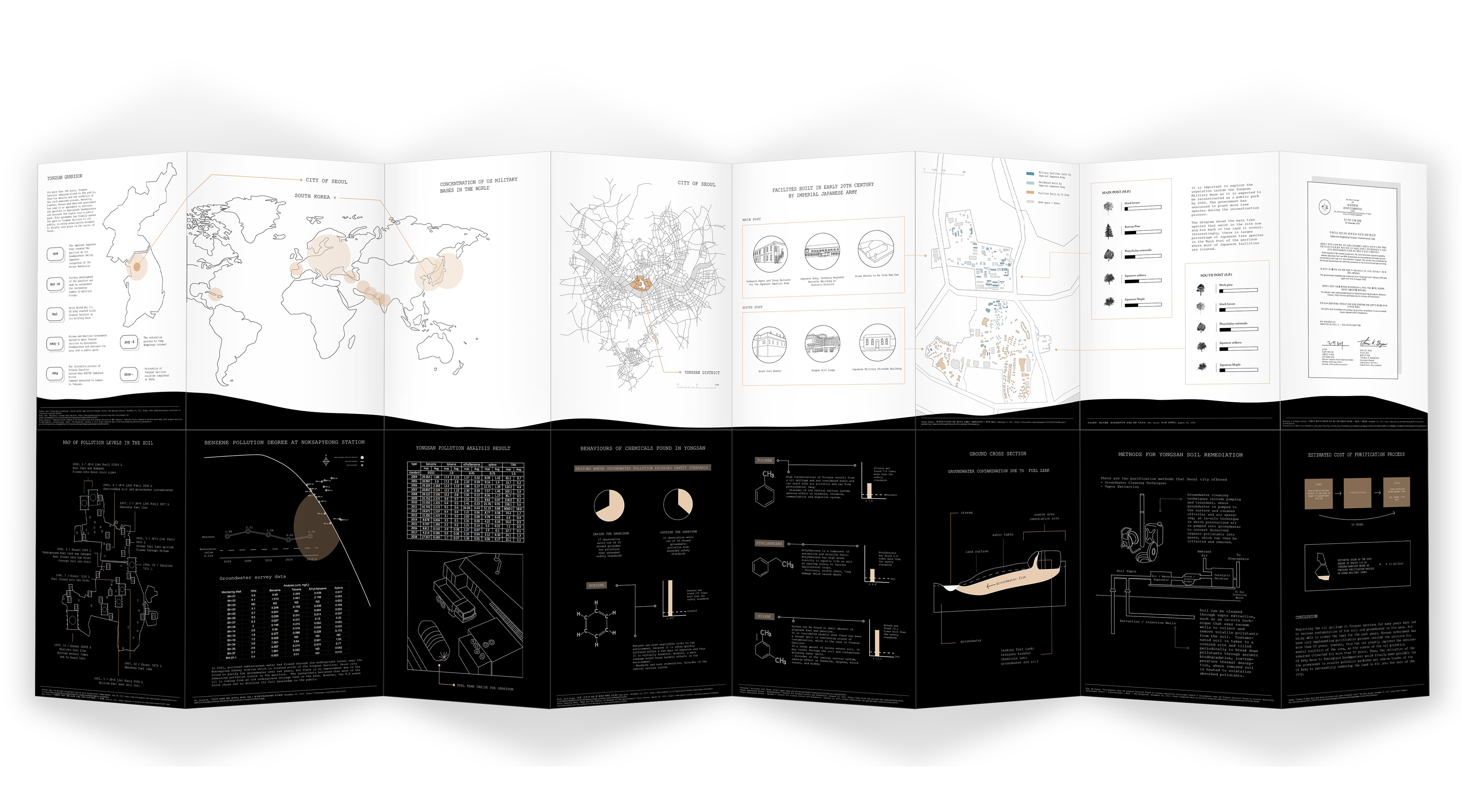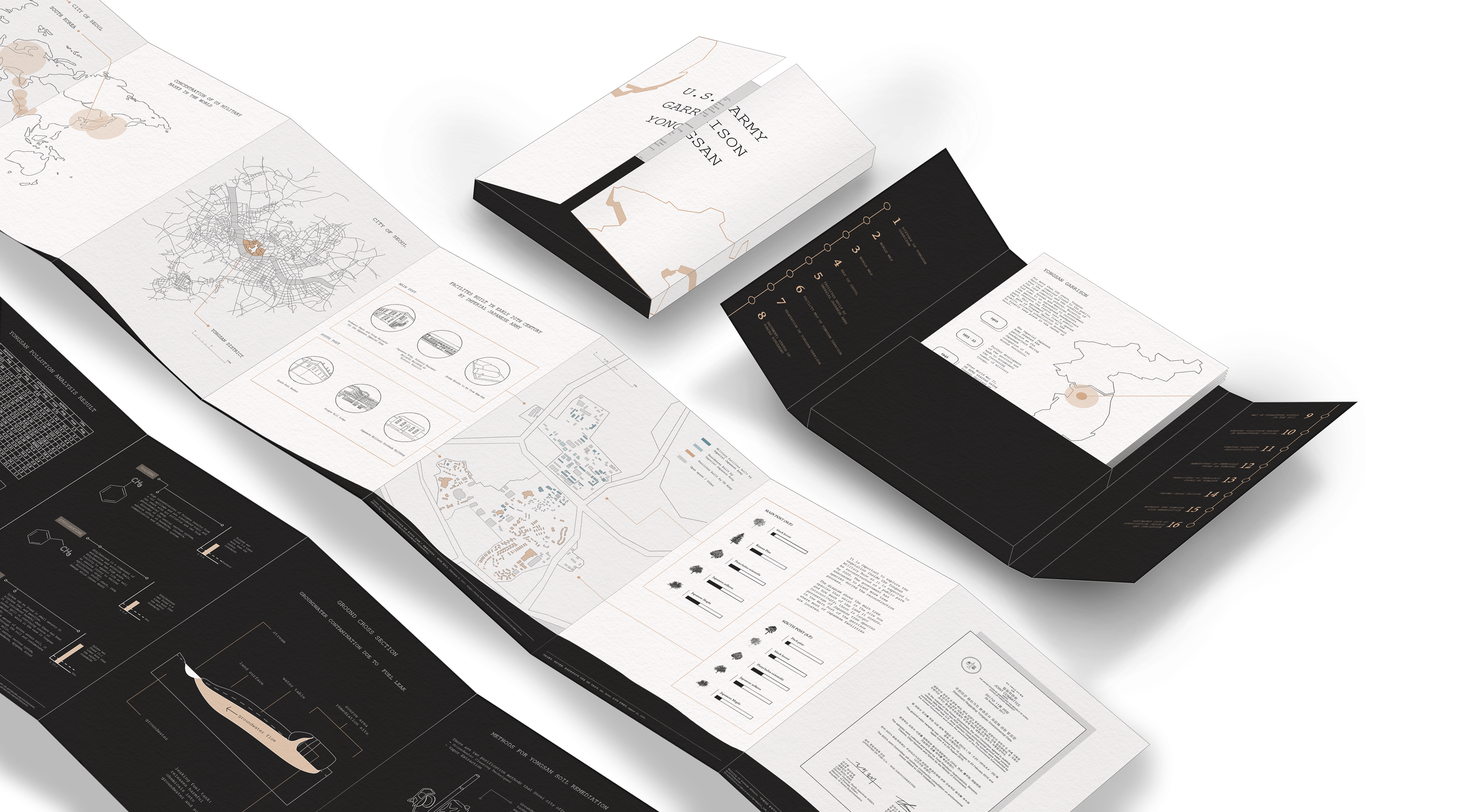 Readers can get a full view of the brochure by unfolding it completely. The black background was used at the bottom/back part of the brochure to emphasize the information that was kept confidential to the public until it was finally revealed after the Korean and American governments had come to an agreement recently to relocate the garrison and demilitarize the area.