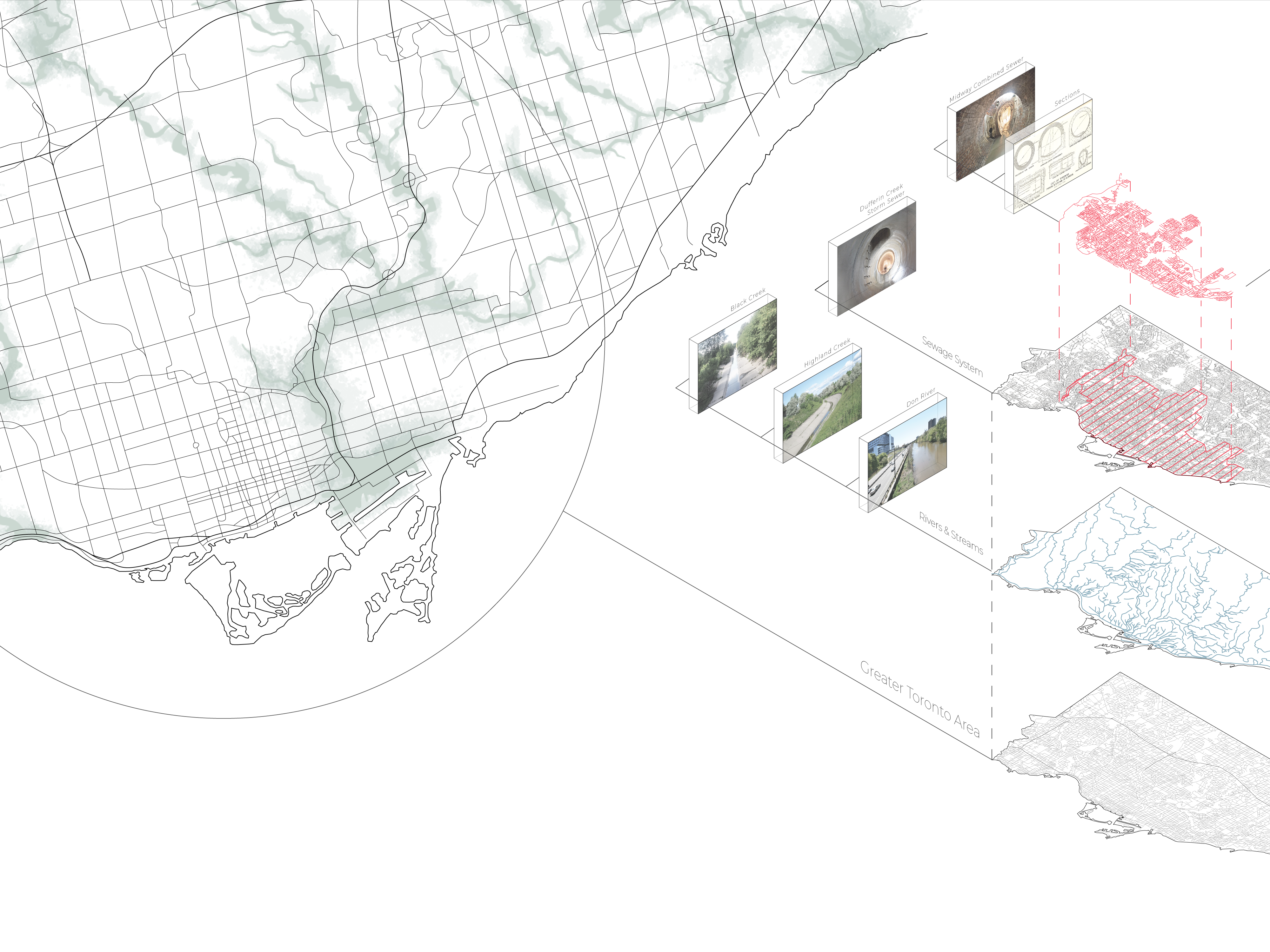 The purpose of this project was to create urban-scale architectural representations of the existing site in Toronto. These architectural drawings were produced using various representation techniques such as plans, axonometric, and infographics. This site analysis covers the relationship between the built environment and the site's infrastructure.