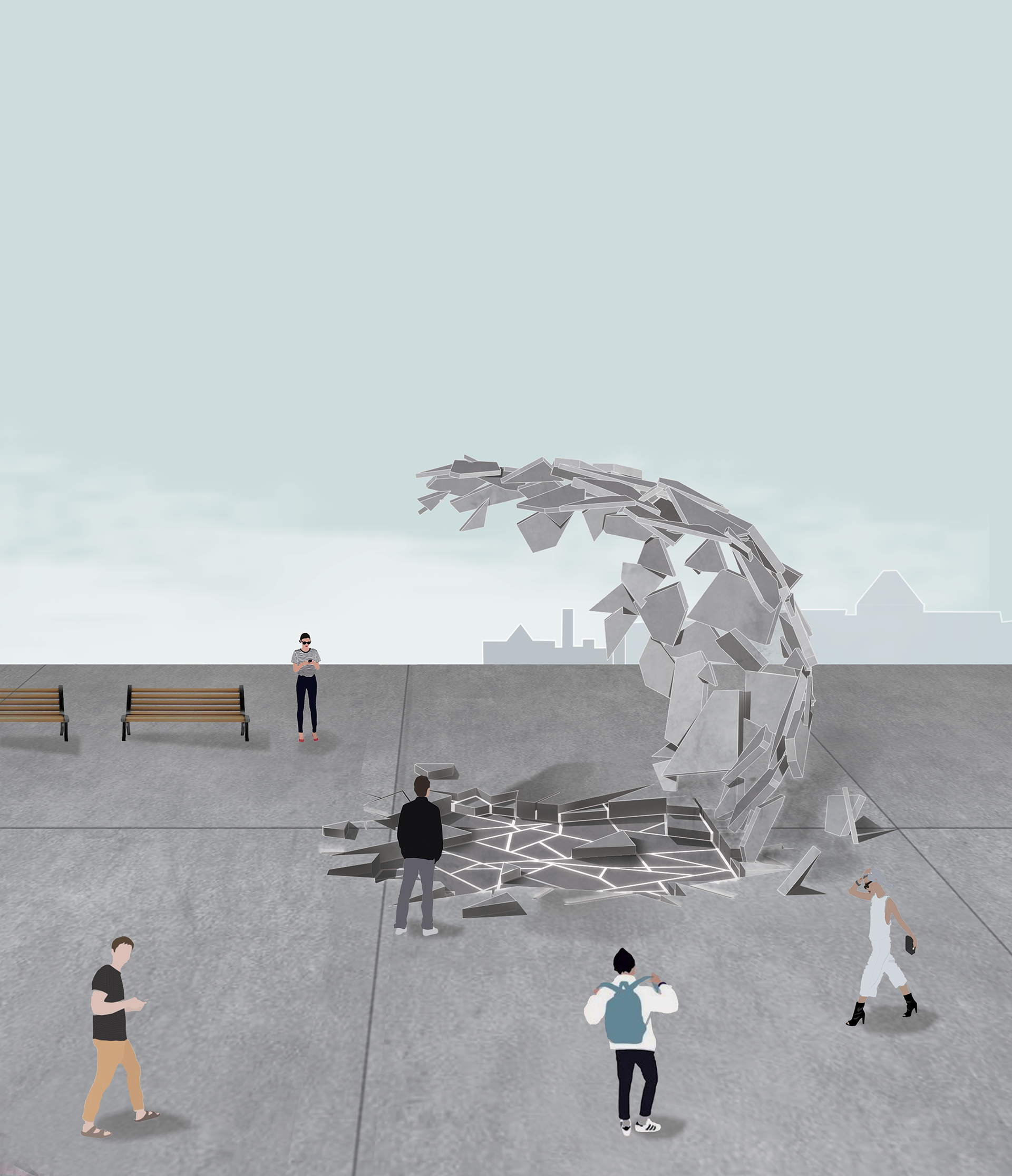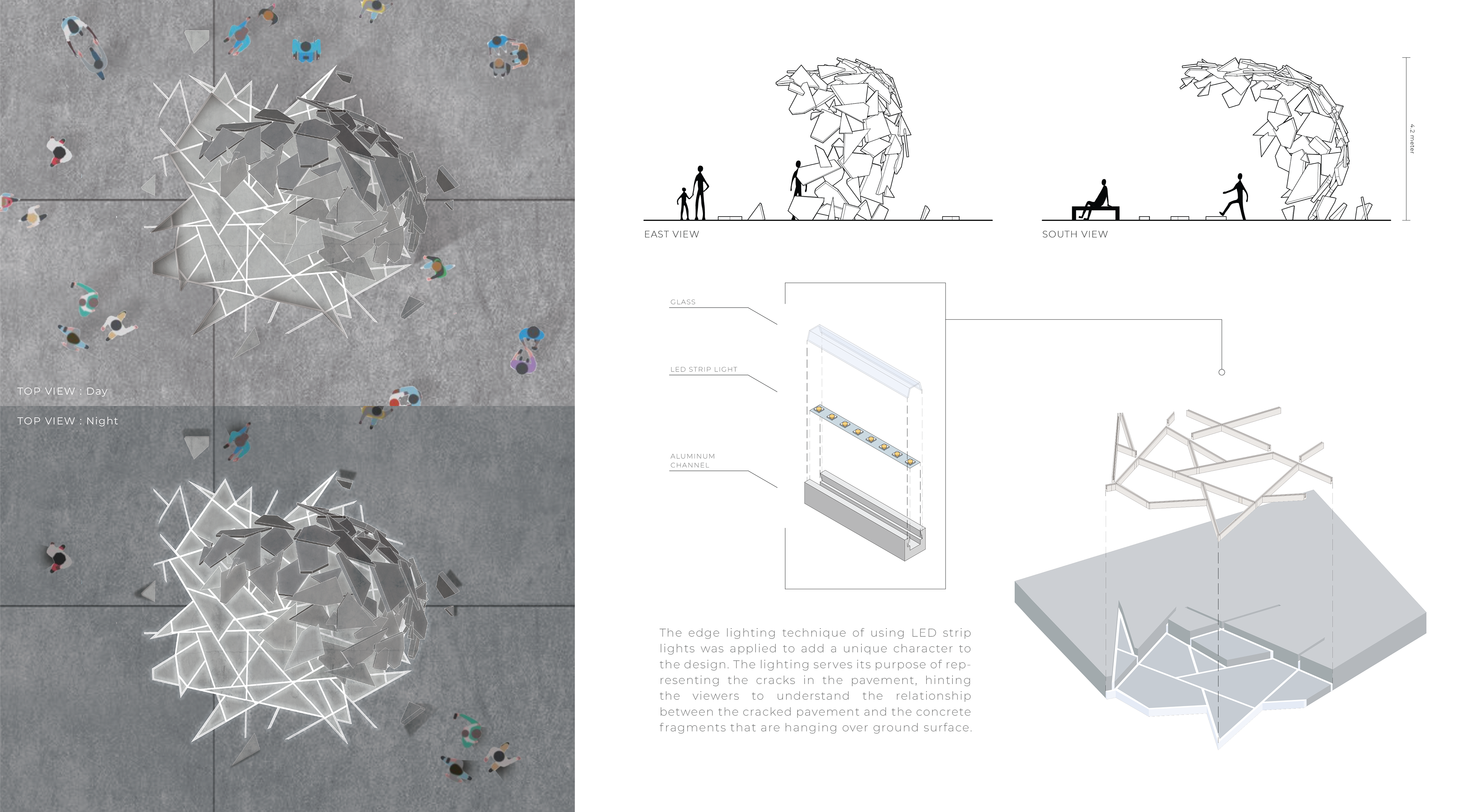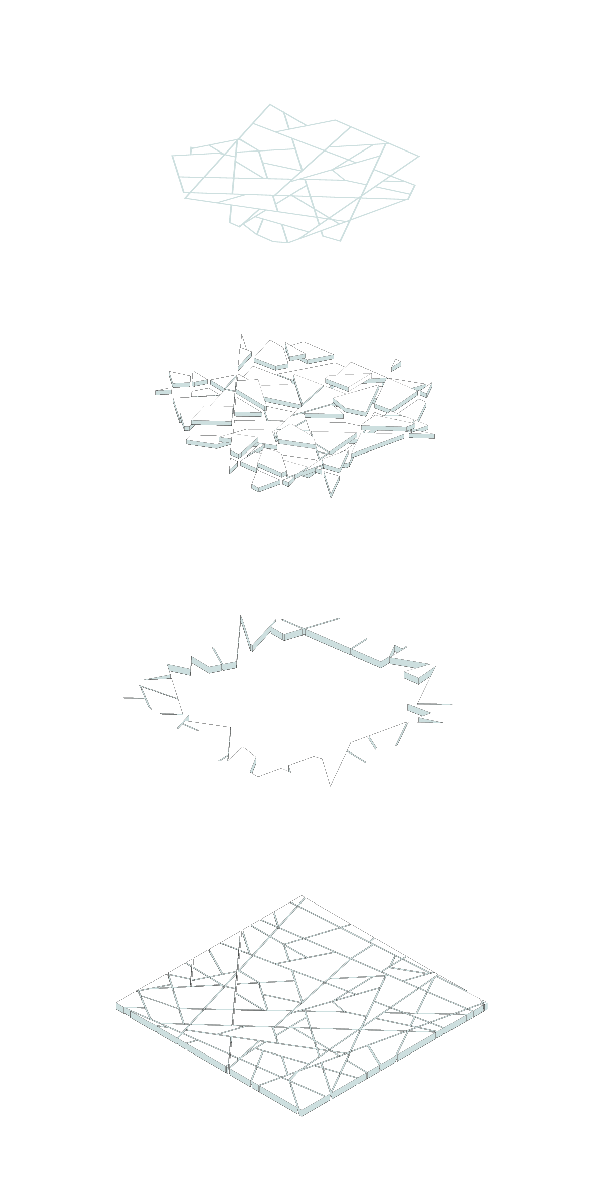 The project “LIFTED” was developed from a simple concept of lifting the ground material to create a canopy. To create a coherent design structure, the word “fragment” became the pivotal point in developing and communicating our design concept.